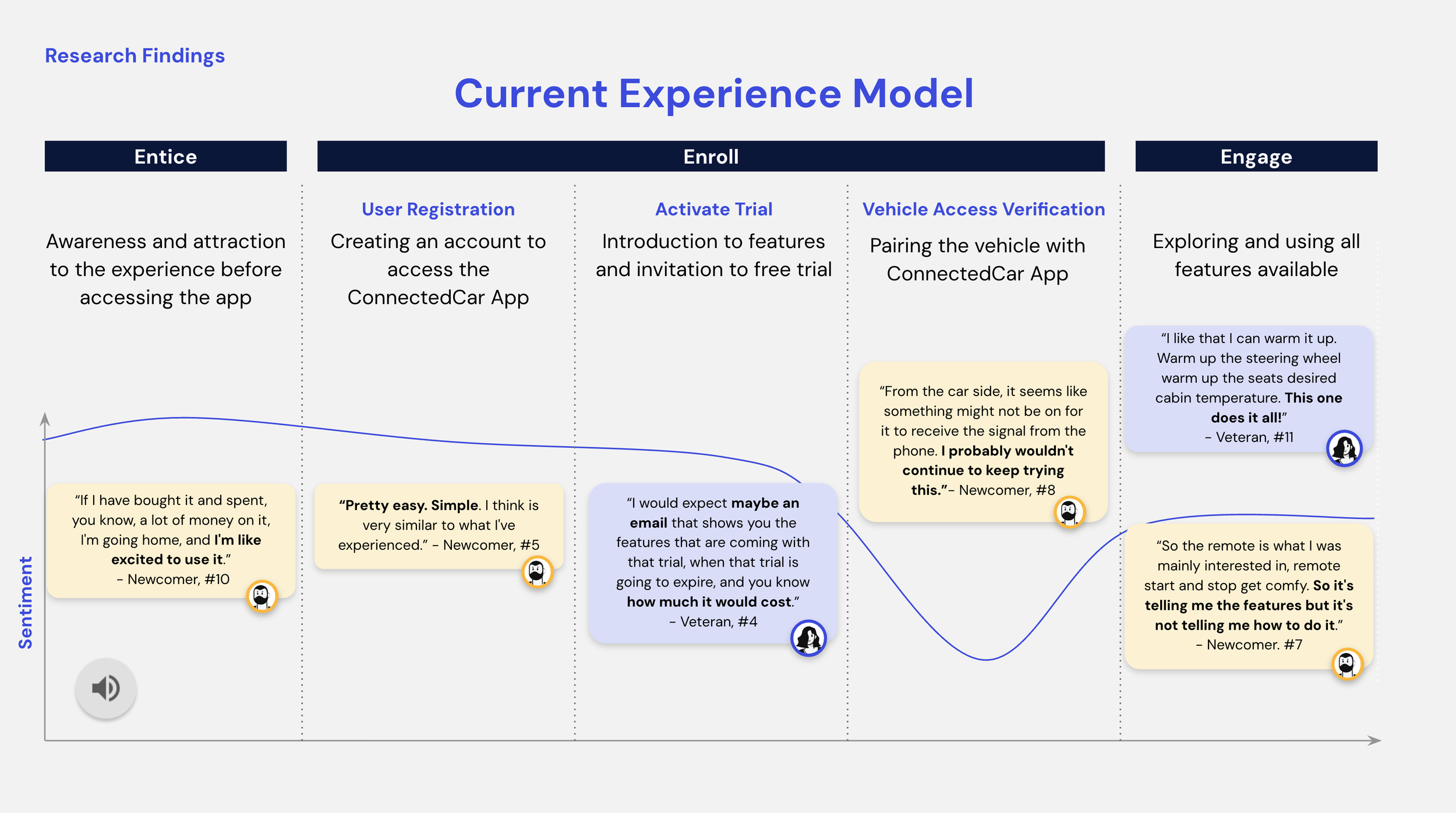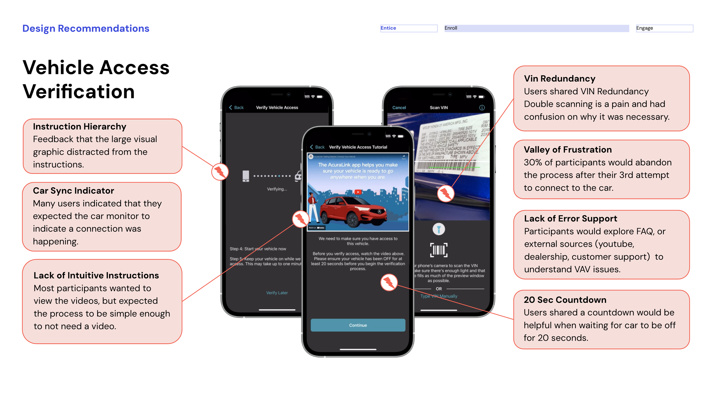The research revealed systemic barriers such as unclear instructions, redundant VIN scanning, and lack of dealership onboarding. We delivered UX recommendations spanning account creation, trial activation, and vehicle verification—framed as both “quick wins” and longer-term opportunities.