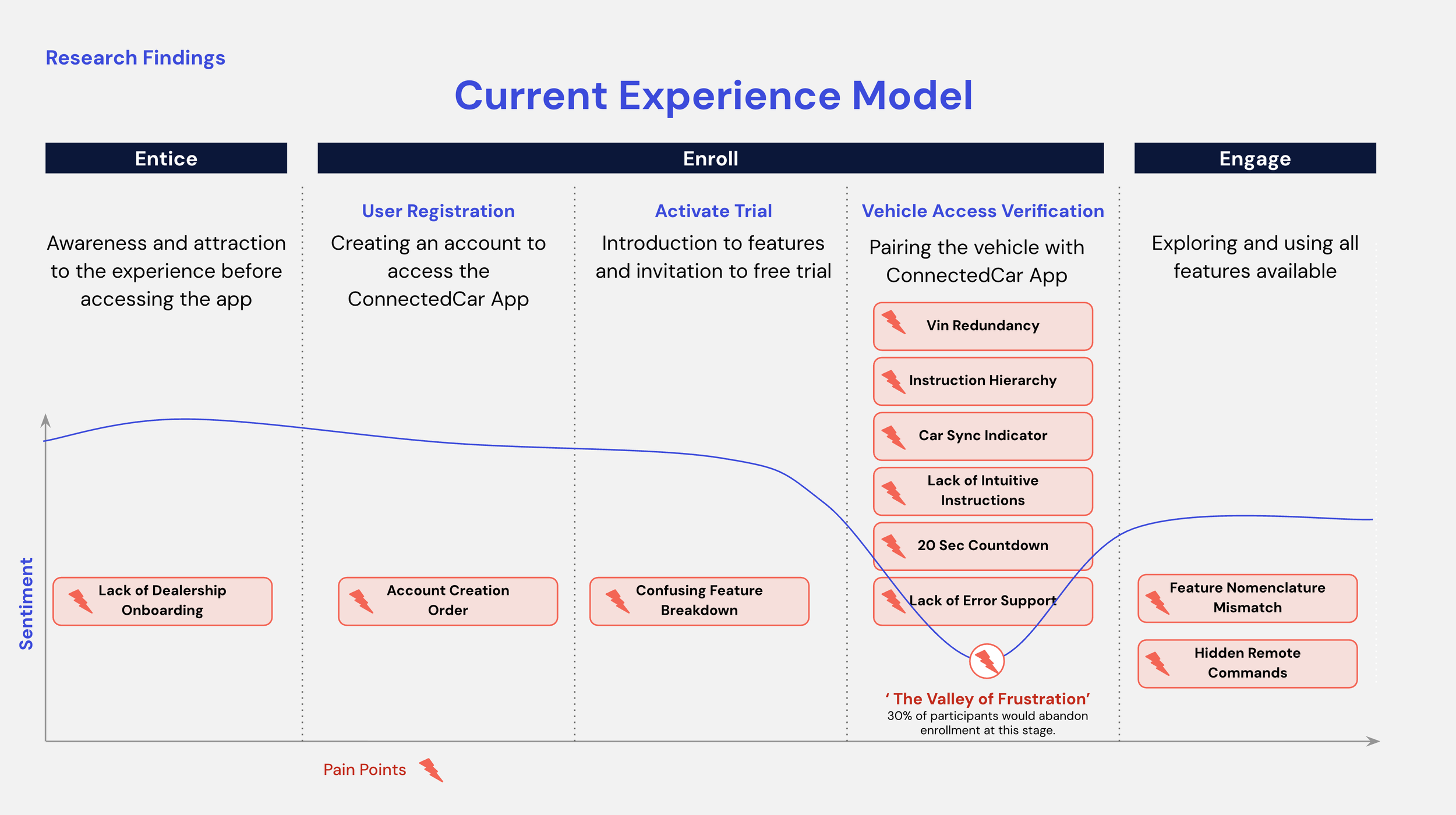Created a detailed experience map of the onboarding process, surfacing the “Valley of Frustration” where 30% of users abandoned at the Vehicle Access Verification step.
